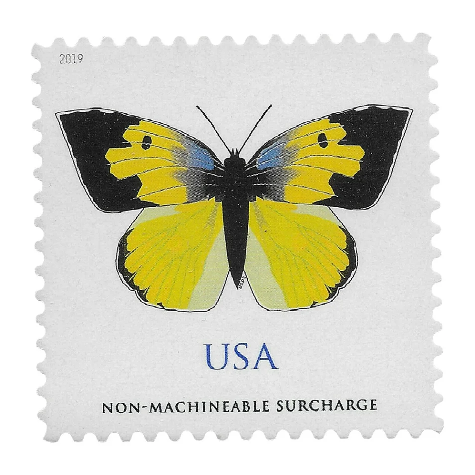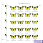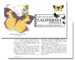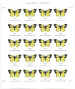 The stamp art was digitally created using images of preserved butterflies as a starting point. The result is a highly stylized, simplified image of a California Dogface (Zerene eurydice) rather than an exact reproduction.